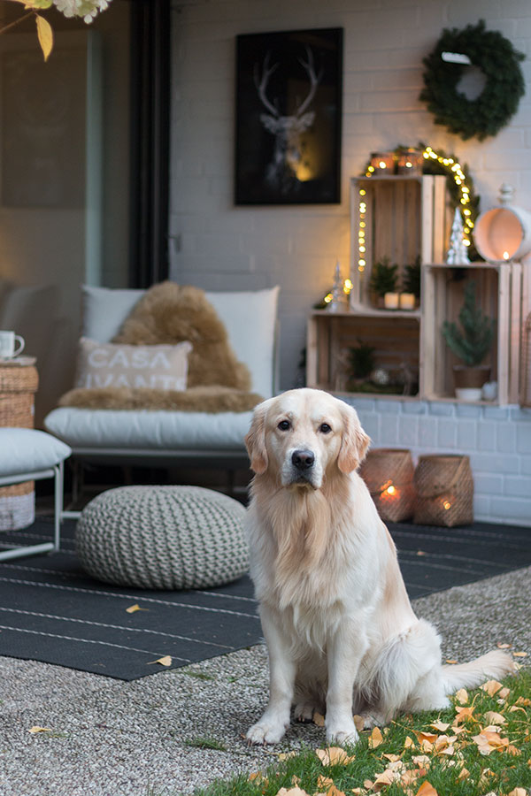 Selbst unser Goldie „Jeff“ wich nicht mehr von meiner Seite, als ich die Terrasse umgestaltet habe. So als wollte er sagen: „Das ist nun mein neues Reich“. Sein dickes Fell wärmt hervorragend kalte Füße ;). Ein weiteres Argument, den Hund mit zum Chillen auf die weihnachtlich geschmückte Terrasse herauszunehmen.