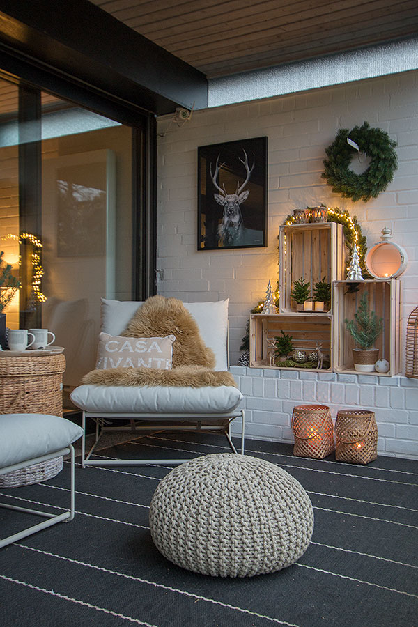 Die weihnachtliche Terrassendeko erhält durch Tannenkränze und Tannengirlanden Kitzbüheler Feeling. Seien wir mal ehrlich, wer hätte nicht gerne im Winter auch zu Hause auf der Terrasse das Gefühl, sich gerade in diesem angesagten Skiort zu wägen? Outdoormöbel mit Fellen belegt, sorgen für noch mehr Gemütlichkeit. Hier lässt es sich prima bei einer wärmenden Hot Chocolate mit Freunden oder der Familie aushalten.
