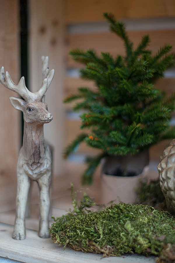 - zweimal die Dekofigur Hirsch in einer Weinkiste platzieren, am besten auf dem Moos