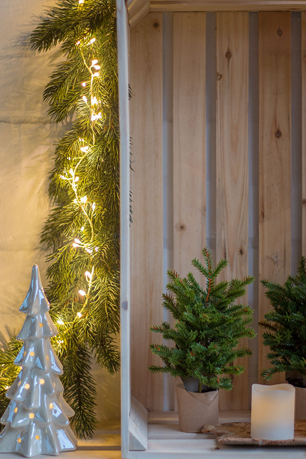 - Tannengirlande um die Weinkisten schlängeln