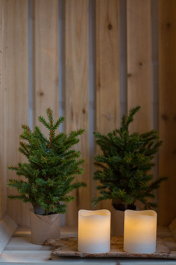 - LED Kerzen lassen die Tannenbäume im Topf strahlen