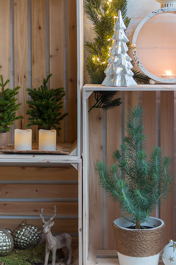 Wer keinen grünen Daumen hat, wählt kleine Dekobäumchen. Ansonsten kann man die Weinkisten mit echten Kieferbäumchen bestücken. Ich habe mich für eine Kombination aus Beidem entschieden. Lappenmoos, Dekohirsche, Zapfen und neutrale Weihnachtskugeln harmonieren perfekt. LED Kerzen und Tannenbäume aus Porzellan lassen die weihnachtliche Deko erstrahlen. Windlichter und Laternen in Naturtönen verbreiten eine wohlige Stimmung.