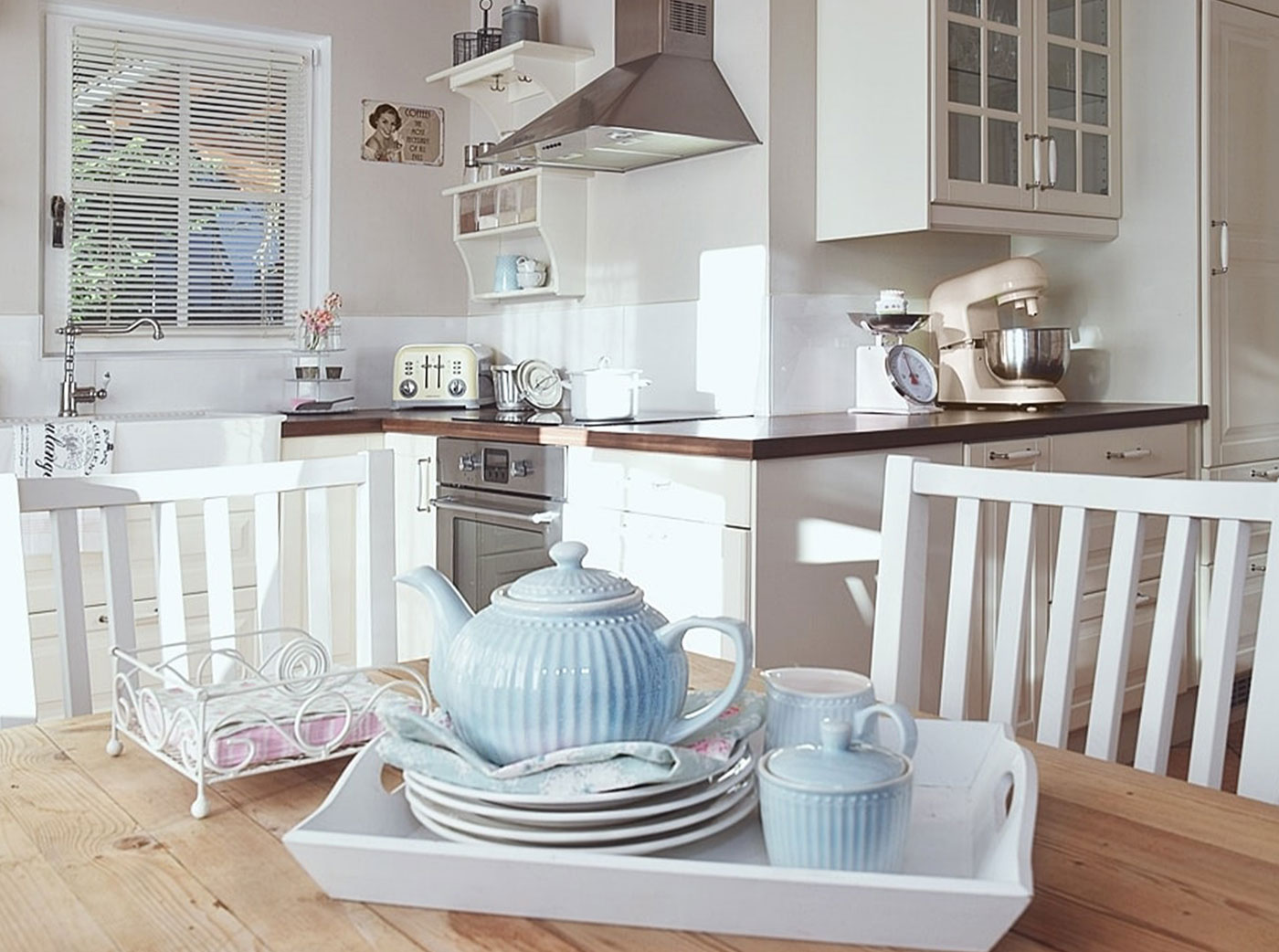 Mein absoluter Lieblingsraum ist unsere sehr geräumige, weiße Landhausküche. Hier kommt die ganze Familie zusammen. Der große Esstisch bietet Platz für gesellige Stunden mit Freunden und Verwandten. Von der Küche aus gelangt man durch eine große Balkontür auf die Terrasse. An warmen Tagen steht die Balkontür immer weit offen, somit werden Küche und Balkon zu einer Einheit. Was die Möbel anbelangt habe ich in meiner Küche bewusst auf zahlreiche Hochschränke verzichtet. Offene Regale lassen den Raum größer wirken und bieten außerdem eine wunderschöne Repräsentationsfläche für besonders schönes Geschirr oder auch diverse Dekoelemente.