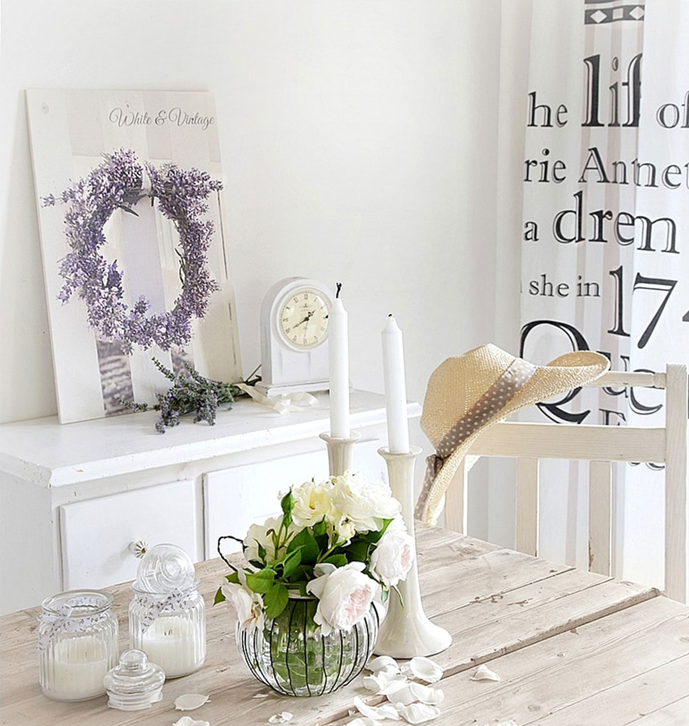 Die Grundfarbe unserer Einrichtung ist Weiß. Ich liebe es, wenn alles um mich hell und luftig ist. Durch das viele Weiß kommen einzelne Farbakzente besonders gut zur Geltung. Je nach Jahreszeit verwende ich gerne pastellige oder auch mal kräftigere Farben. Am liebsten setze ich Farbakzente in Form von Blumen. Blumen sind das ganze Jahr über in meiner Wohnung zu finden. Für mich persönlich ist das Geheimnis eines gelungenen Stilllebens die Harmonie und Verbindung zwischen den einzelnen Objekten. Wenn alle Elemente zusammen eine Geschichte erzählen, dann wird das Stillleben zu einem harmonischen Ganzen und somit zu einem wahren Blickfang. Eine wichtige Rolle bei meinen Dekorationen spielen alte Gegenstände aus längst vergangenen Zeiten. Ich liebe solche Dinge, die Geschichte und Vergangenheit schreiben, für mich sind das kostbare Schätze.