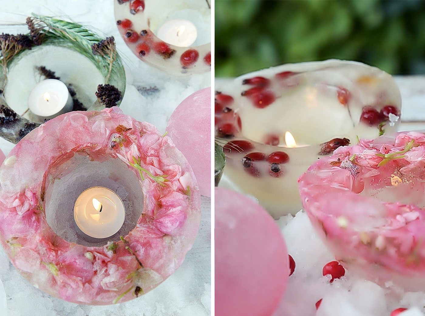 Mein Garten ist meine große Leidenschaft. Auch hier dekoriere ich sehr gerne und immer wieder neu. Im Winter, wenn die Blütenpracht schläft, versuche ich mit winterlichen Dekorationen Leben in meinen Garten zu bringen. So zum Beispiel mache ich jedes Jahr meine geliebten Eiswindlichter, die abends ein wunderschönes Licht zaubern. Da bei uns auf der Schattenseite kaum die Sonne scheint, halten diese frostigen Schönheiten auch sehr lange. Im Haus dekoriere ich im Winter sehr gerne mit Naturmaterialien aus dem Wald und meinem Garten. Gleich nach Weihnachten ziehen dann auch schon bald die ersten Frühblüher in meiner Wohnung ein. Winterdecken, sowie Kissen werden gegen farbenfrohe Kissen und Plaids ausgetauscht und verbreiten so gute Laune auch an tristen Wintertagen. Da ich eine hoffnungslose Romantikerin bin, dürfen natürlich auch Kerzen besonders im Winter nicht fehlen. Das sanfte Licht des Kerzenscheines sorgt für eine gemütliche, stimmungsvolle Atmosphäre und bringt ein wenig Helligkeit und Wärme in die dunklen Wintertage.
